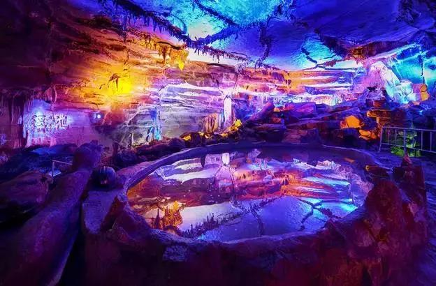 瑶池,太上老君,炼丹炉,倒影池(俯视池水,倒影出来的溶洞顶部犹如田地,山川,森林,海底世界,好似在天上遥望人间),瑶池旁边有王母娘娘的玉床,座椅。