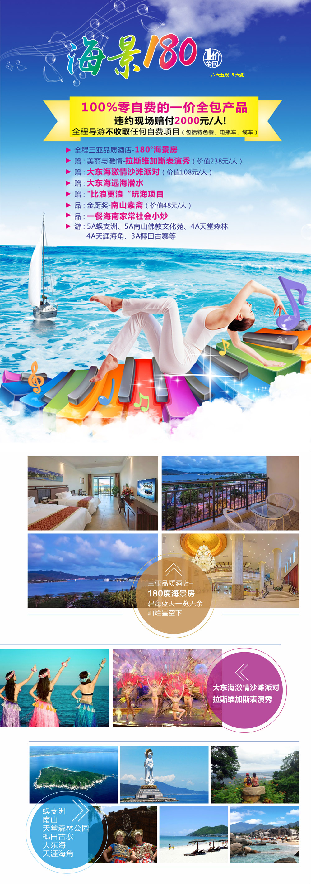 100%零自费的一价全包产品,违约现场赔付2000元/人! 全程导游不收取任何自费项目(包括特色餐、电瓶车、缆车) A绝不增加自费景点/项目推荐:开开心心旅游,快快乐乐体验、明明白白消费 B绝不增加行程以外购物店:消费透明,畅行无忧。 C绝不更换行程所含景点:不可抗力因素除外:如台风、暴雨、国家政策,战争等。 D绝不压缩游览时间:保证足够的游览时间,深度享感受海岛风光,好好和大海亲密接触。 |