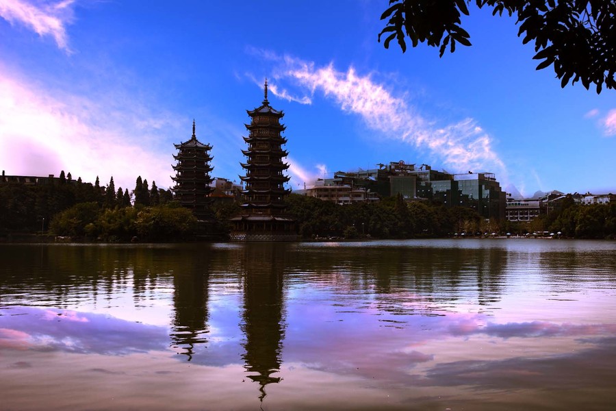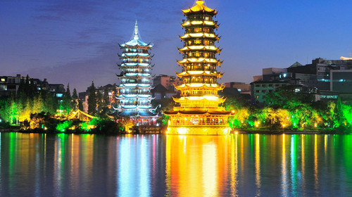 游览桂林地标性建筑【日月双塔】(登塔,游览约60分钟)坐落在衫湖中心,是桂林市中心杉湖中的两座宝塔,日塔为铜塔,月塔为琉璃塔,两塔之间以湖底一条10多米长的湖底隧道相连。每到夜晚,远看两座塔在灯光映衬下分别散发着金银两色光芒,倒影在湖中的景象格外漂亮。